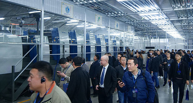 Hebei Xindong is the leading packaging printer in its region, and is especially active in the fields of pharmaceuticals, foods, alcoholic beverages and high-quality board packaging. The declared goal of president Kong Jiandong is to become the number-one provider for pharmaceuticals packaging in Northern China. The recently installed Rapida 105, a seven-colour press with UV coating capabilities, is the company’s second investment after the purchase of a Rapida 164 for six colours and coating in 2014. The visitors were treated to a show of high-quality print production on both presses – including changeovers to special applications using gold. silver and film substrates.